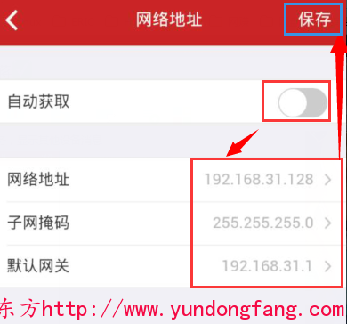 把自动获取的开关按钮打到关闭状态,然后再点击下面的网络地址旁边处就可以进入更改IP地址的界面。子网掩码,默认网关也是使用同样的方法更改就可以了。