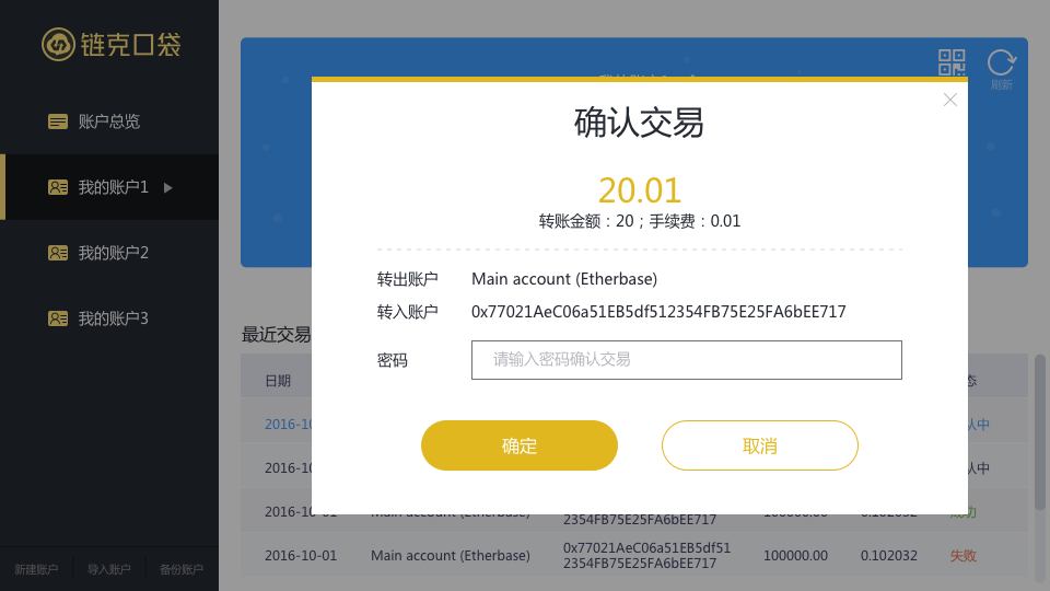 三、在确认交易的界面中检查交易信息,确认无误后输入密码,点击【确定】,等待发送完成